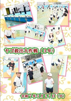 プール掃除を間近にひかえ、プールにいるヤゴ(トンボの幼虫)を3年生が救出しました。藤井寺市役所から環境衛生課のみなさんが出張授業で来てくださって、ヤゴを救出するための道具や水辺の生き物リストを見せてくださいました。ぬるぬるした水にためらっていた子どもたちも、だんだん慣れてたくさんヤゴを救出できました。