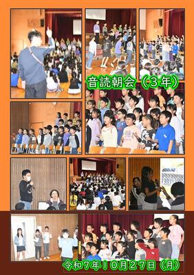 今日の朝は、3年生による音読朝会でした。「やだくん」と「うんとこしょ」を振り付けしながらリズミカルな音読で表現しました。運動会が終わってからの日々を一所懸命に練習した成果が十分に表れていました。3年生の表現を聞いている他学年も、体で調子をとりながら聞き入っていました。3年生よくがんばりました。